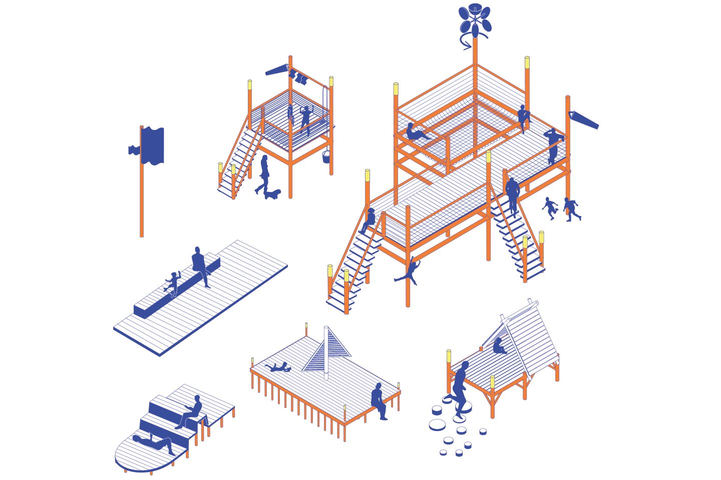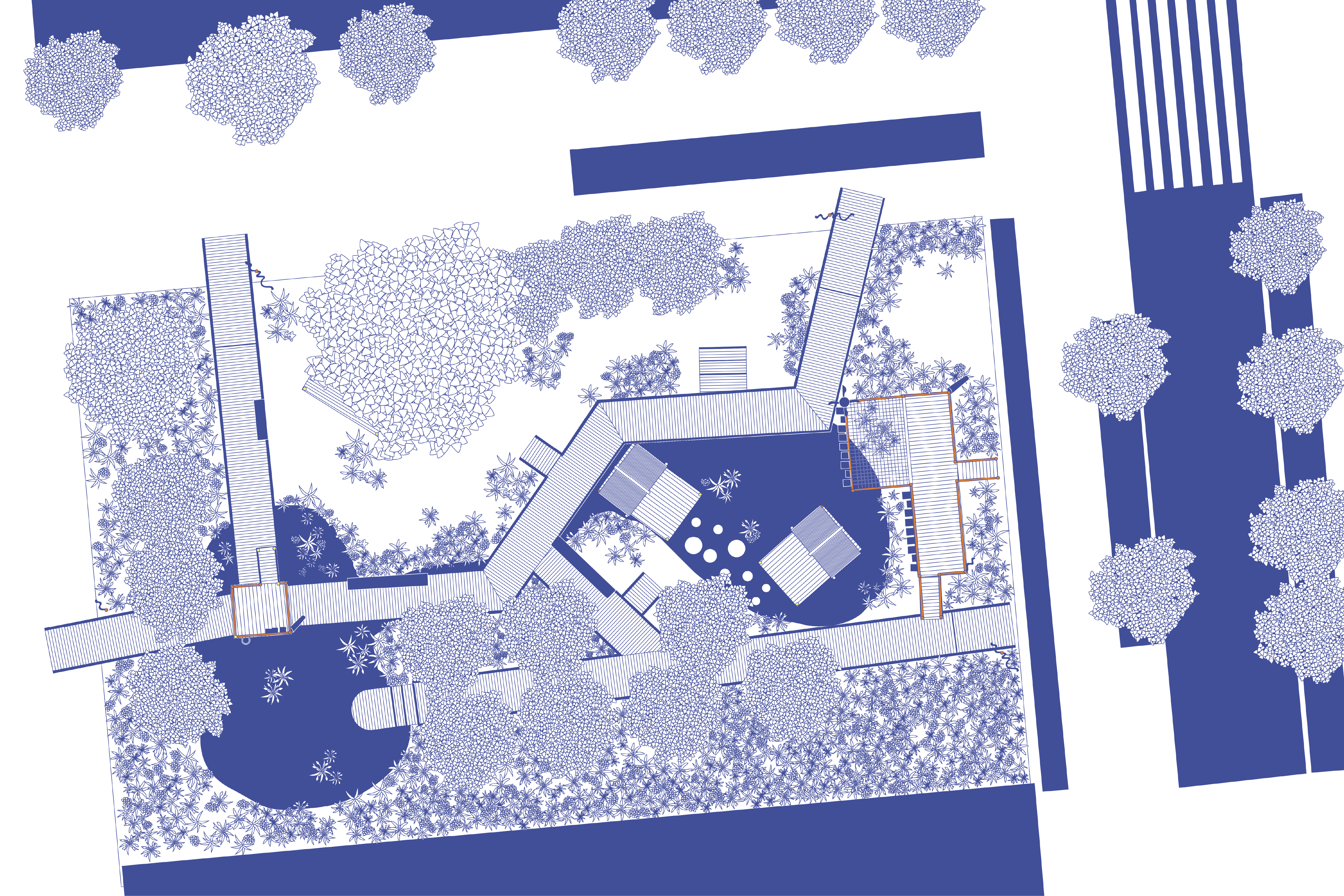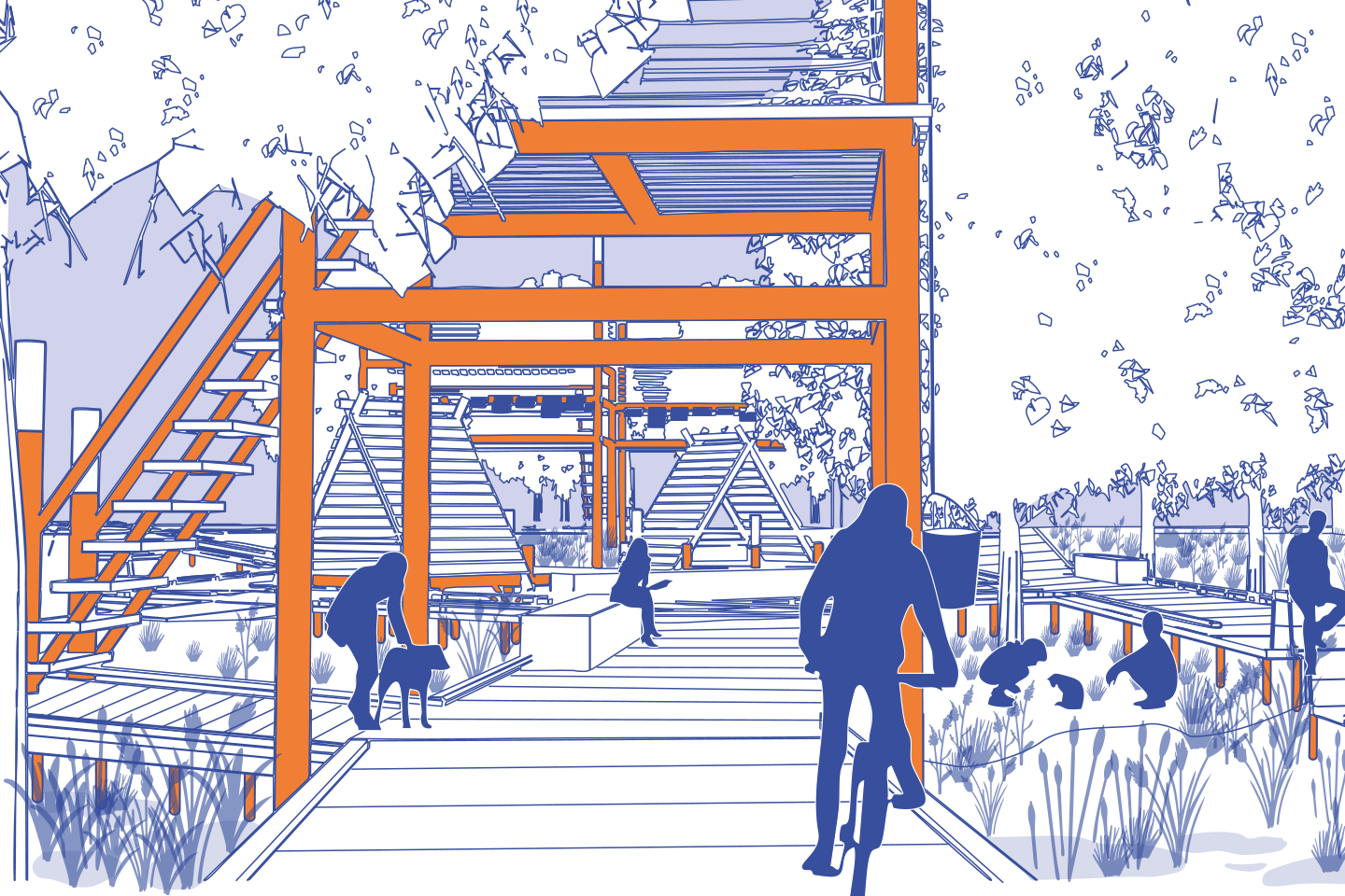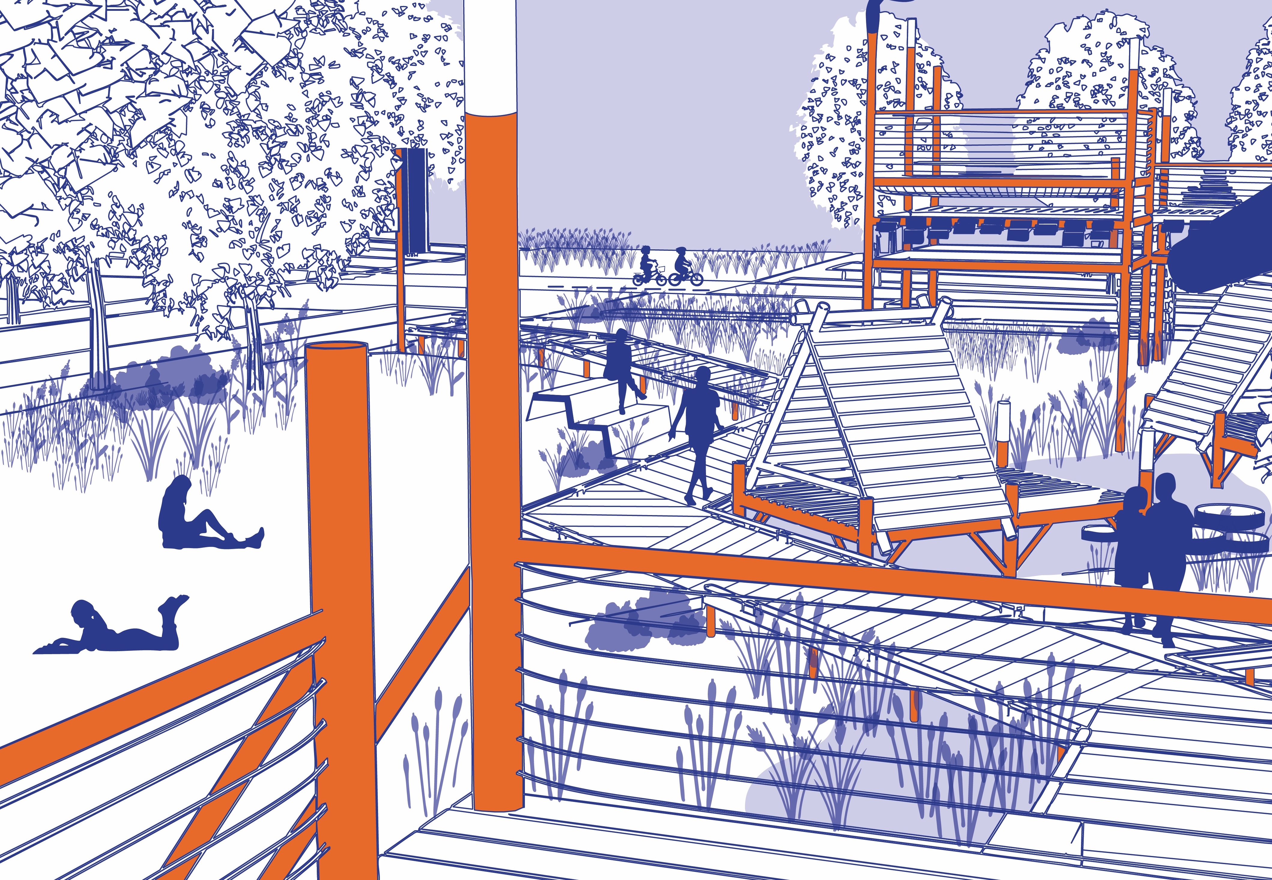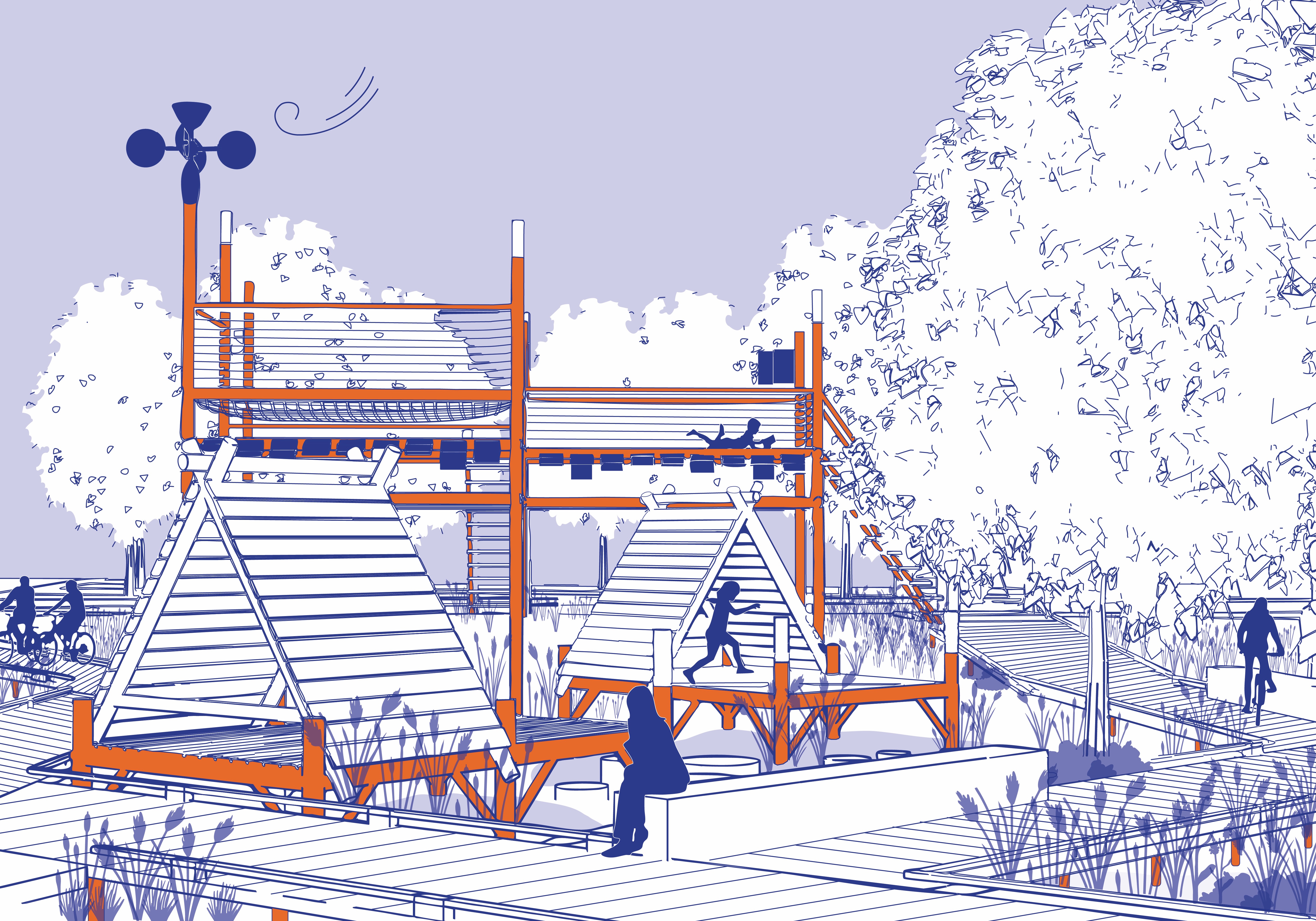 des eaux de pluie, leur récupération et leur mise en scène à travers des jeux mécaniques et la formation de noues, régulées par l’infiltration et la végétation. Des passerelles sur pilotis accompagnent ces dynamiques sans empiéter sur les milieux plantés. La proximité d’une école maternelle permet d’envisager des ateliers pédagogiques autour de la biodiversité et des cycles naturels, faisant de ce square un lieu de déambulation, de jeux intergénérationnels et de contemplation.