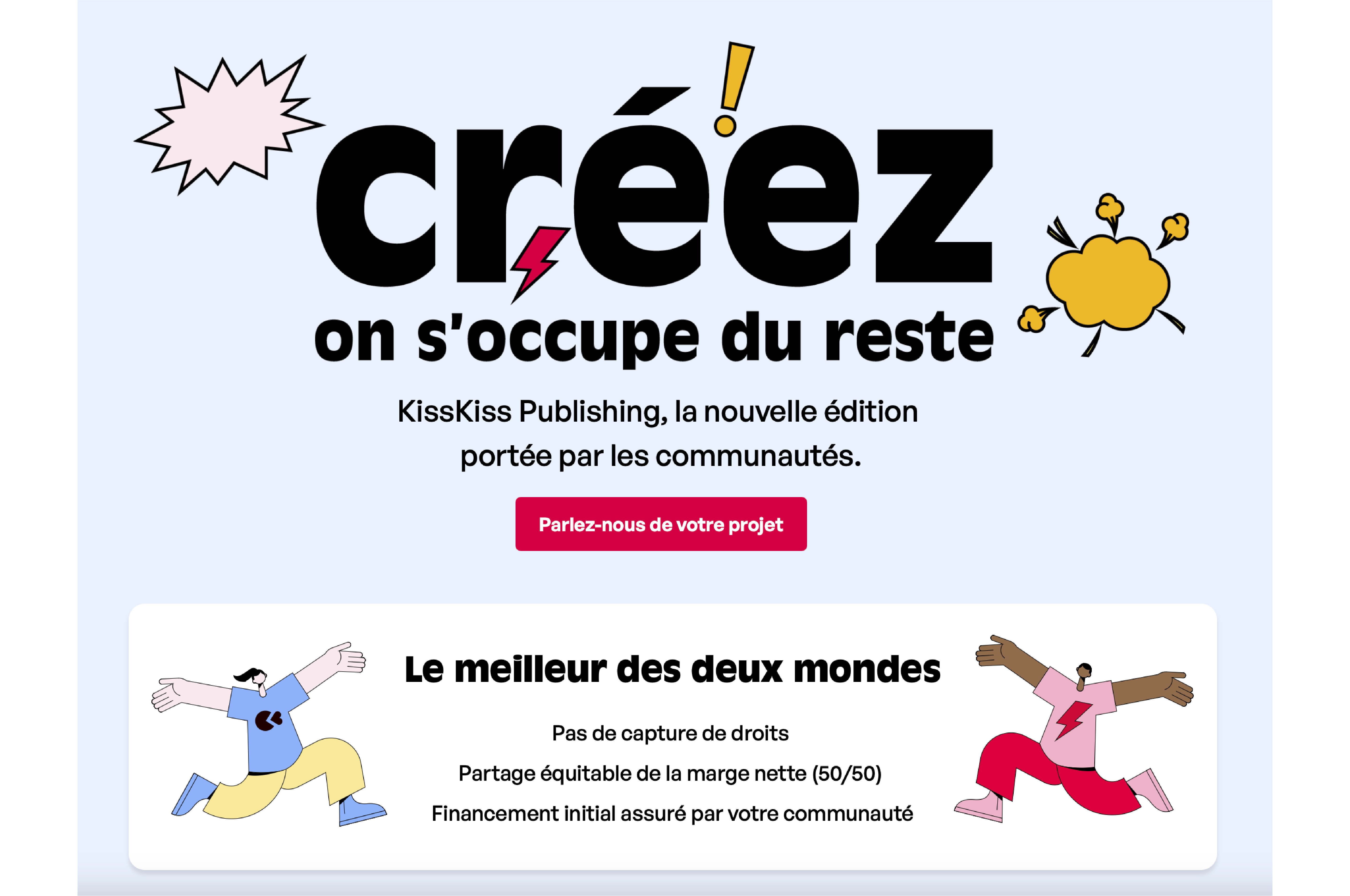 Dans le cadre de mon alternance en tant que graphiste chez Ulule, j'ai été missionnée pour créer l'animation de la homepage ainsi que la landing page présentant leur nouveau service : KissKissPublishing, une maison d'édition qui rémunère justement les créateur·ices.